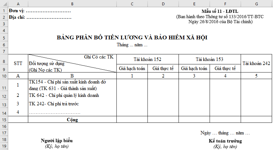 Mẫu Bảng phân bổ tiền lương và BHXH theo Thông tư 133 trên Excel