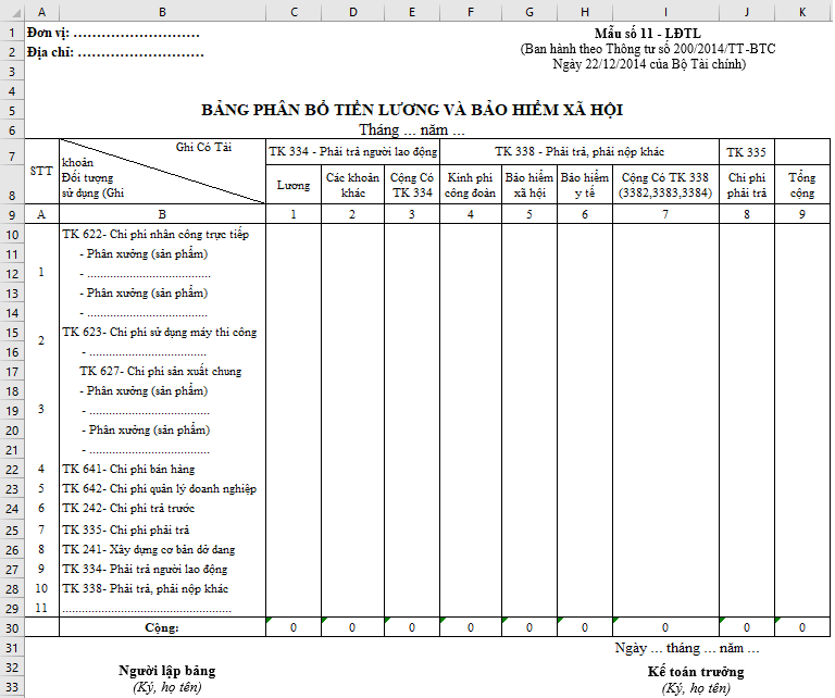 + Căn cứ vào các bảng thanh toán lương, thanh toán làm đêm, làm thêm giờ… kế toán tập hợp, phân loại chứng từ theo từng đối tượng sử dụng tính toán số tiền để ghi vào bảng phân bổ này theo các dòng phù hợp cột ghi Có TK 334 hoặc có TK 335.